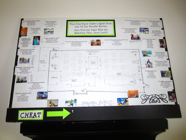 We gave a copy of these movie to movie quote cheats to our wedding coordinator, as well as kept it hanging on the seating chart itself.