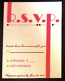 Lastly, we decided to do an RSVP postcard rather than the traditional mail-in envelope back to us. We wanted this for two reasons: 1) being a little more fun (& maybe something people haven’t seen before) and 2) stamps for this were 29 cents each rather than 44! So, once again…great suggestion Angela! Here’s a look at what we’re talking about: