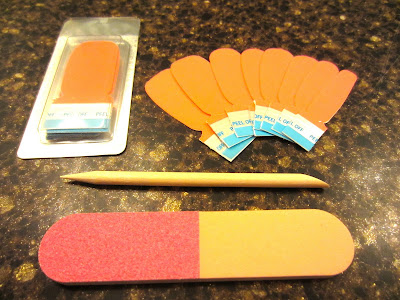Each box comes with 16 nail strips in different sizes, a wooden cuticle stick and a nail file/softener.