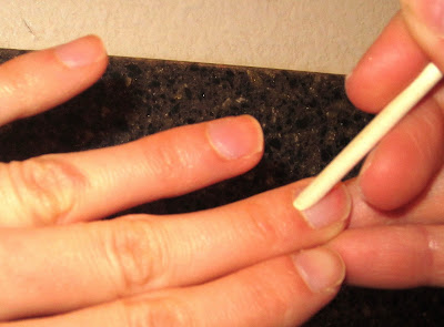 Firmly smooth over entire nail. Run flat side of cuticle stick along edge of strip to firmly bond strip to nail.