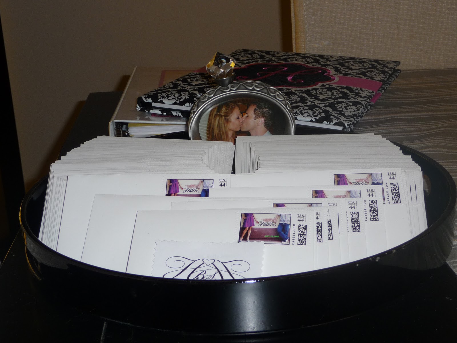 For the sake of privacy to our guests, I decided to cut out our logo and set it on the envelope to cover where the recipient’s address is. That should explain why they look like they do in this picture. Obviously, in real life we got the addresses printed on the envelopes, (which by the way was worth EVERY extra penny!) Having them sent over to us already pre-addressed has been one of my best desicions yet. Now, we already have our guest list and addresses ready and uploaded for our invitations, BONUS! 🙂